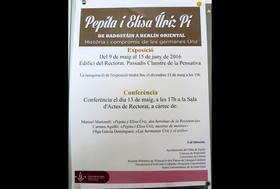 El 13 de mayo de 2016 se inauguró en la Universidad de Lleida una de las exposiciones más importantes de las hermanas Úriz de cuantas se han celebrado hasta la fecha. Se acompañaba de una charla que reunía a Manuel Martorell, Olga García y Margarita Bremer e incorporaba a Carme Agulló y Salomó Marques, que han dado un nuevo impulso a la exposición original. Suponía ir al lugar donde Pepita desarrolló una parte muy importante de su vida profesional, y nosotros estrenamos la segunda versión de la exposición que se iniciamos hace dos años. Suponía además la primera exposición en Catalán y que va a exponerse, aparte de Lleida, en la Universidad de Girona, el museo del Exilio en Figueras, la Universidad de Valencia, en Tarragona y la Institución Rosa Sensat de Barcelona.