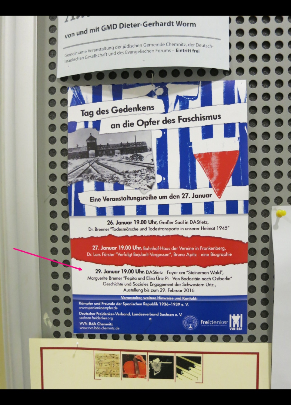 Margarita Bremer, amiga y colaboradora de la exposición de las hermanas Úriz en Alemania, organizó el 3 de febrero de 2016 la exposición de las hermanas Úriz en el edificio DAStiel, en la ciudad de Chemnitz. Nuestras ilustres vecinas estuvieron en el vestíbulo de este edificio por el que pasa casi un millón de visitantes al año y que aloja el Museo de la Naturaleza, una biblioteca, librería, la Universidad popular, Galería, un café…